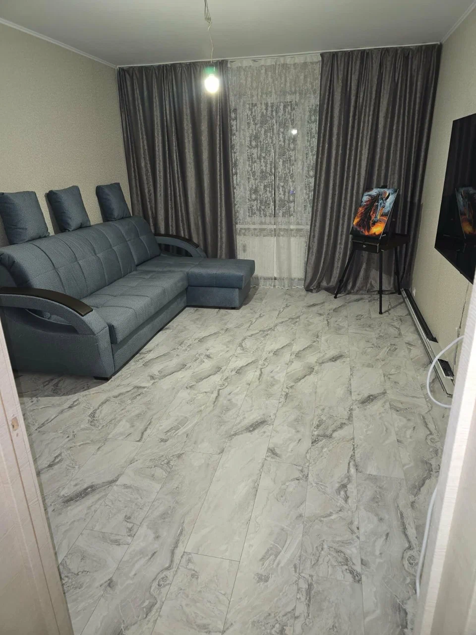Метраж — порядка тридцати метров. Ещё есть две комнаты, в которых уложено также порядка тридцати; в общей сложности — 60 м.