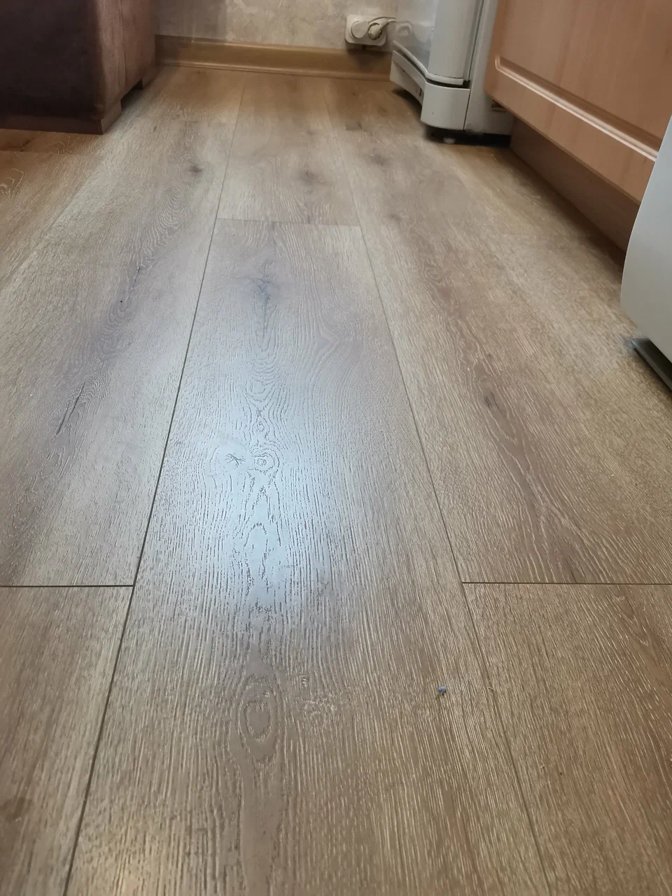 Внешний вид: Цвет "Дуб Морская Гавань" очень красивый, выглядит как натуральное дерево. Пол теплый, ходить по нему очень приятно.
