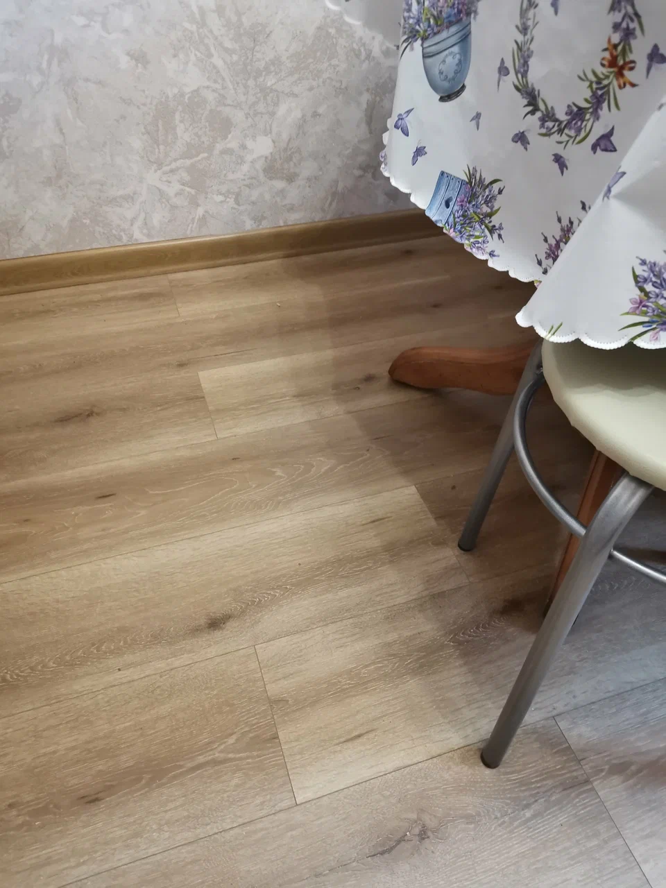 Уложили MSPC на кухню, не ожидали такую ощутимую разницу с обычной плиткой, гораздо теплее. Спокойно выдерживает нагрузку тяжёлого стола из массива.